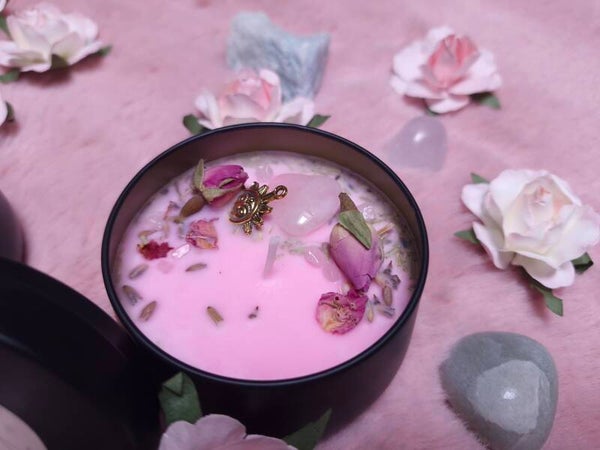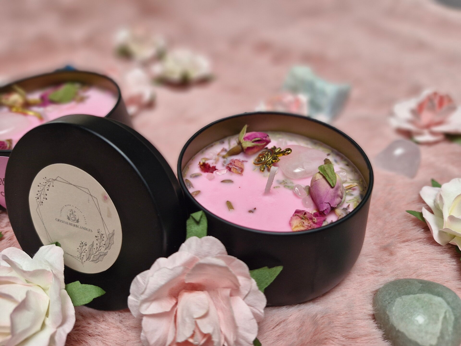 Our Self-Love Candle is a gentle reminder to care for yourself. Infused with rose and jasmine essential oils, it fills your space with a soothing floral aroma that encourages peace, love, and confidence. Each candle is adorned with a rose quartz crystal — the stone of unconditional love — and a delicate blend of dried herbs and flowers, creating a beautiful ritual for self-love, healing, and positive energy.