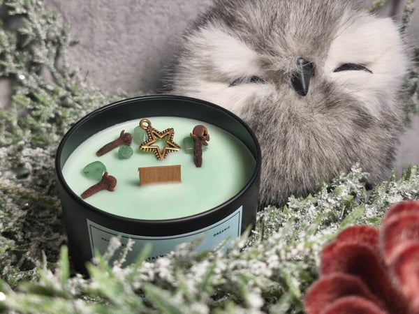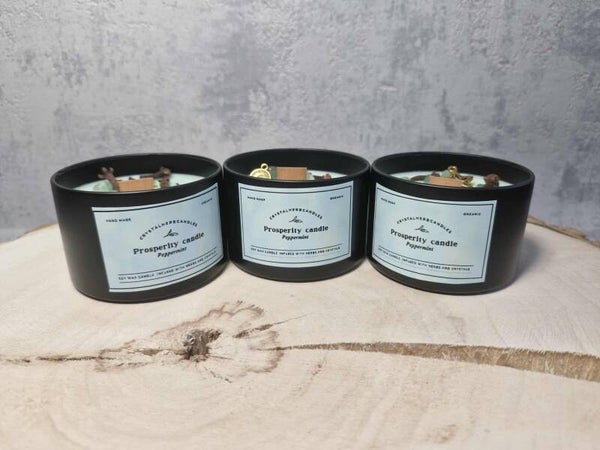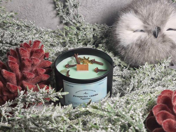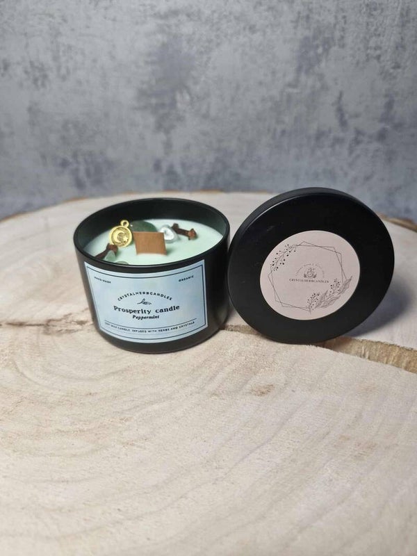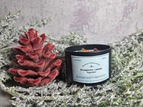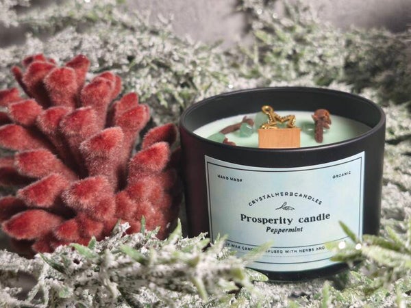 Invite abundance and good fortune into your life with our Prosperity Candle. Crafted from natural soy wax and infused with the refreshing scent of peppermint, this candle energizes your space and uplifts your spirit. Its soft mint-green color symbolizes growth and prosperity, making it the perfect companion for the winter season. Each candle is enriched with green aventurine, the stone of luck and opportunity, and a blend of carefully selected herbs to attract wealth, success, and positive energy.